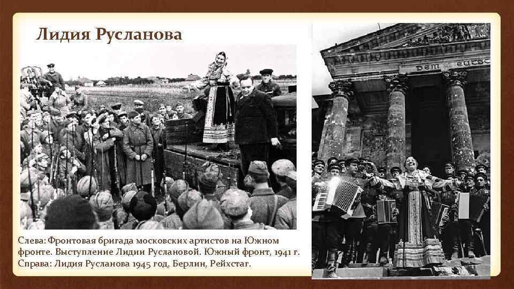 Исполнительница народных песен Лидия Андреевна Русланова выступала перед бойцами на фронтах ещё Первой мировой войны, она продолжала петь и в период Великой Отечественной. «Гвардии народная артистка» – так ее окрестили на фронте. За четыре года войны Лидия Андреевна дала более 1200 концертов. «Мама во время войны не вылезала буквально с фронта. Она даже на лыжах передвигалась из одной части в другую, чтобы дать концерт» – вспоминала дочь Лидии Руслановой Маргарита Крюкова. Вместе с советскими войсками Лидия Русланова дошла до Берлина. 2 мая 1945 года Лидия Русланова спела на ступеньках поверженного Рейхстага знаменитые «Валенки», самую любимую бойцами песню из своего репертуара. Как она говорила: «Валенки не подшиты, стареньки, до самого Берлина прошагали».