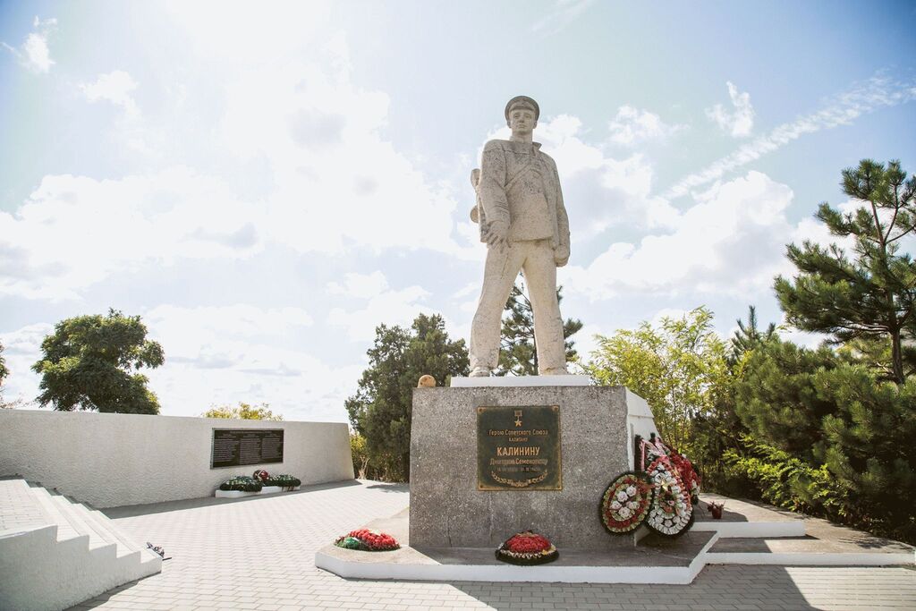 При освобождении Анапы от немецко-фашистских захватчиков с моря был совершен отвлекающий маневр. Десантники погибли и последним их капитан Дмитрий Калинин. Причём так геройски, что до глубины души поразил хладнокровием и мужеством самих немцев. Он подпустил их к себе поближе и подорвал себя и их гранатой. Неприятельский офицер приказал с почестями похоронить отважного моряка, на его могиле поставили железный крест. После войны на его месте появился монумент.