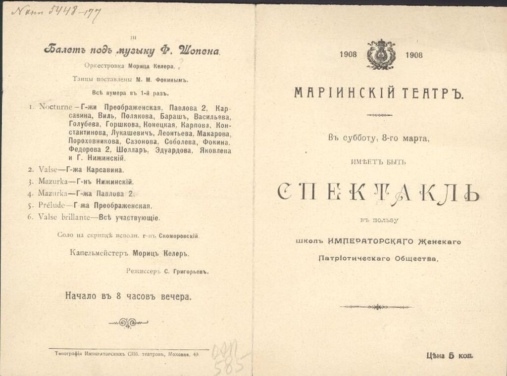 23 февраля 1907 года публике была представлена танцевальная сюита «Шопениана». Вальс исполняли Анна Павлова и Михаил Обухов (товарищ Фокина по балетной школе). «В этом танце не было ни одного пируэта, ни одного трюка, но как поэтичен, как прелестен и увлекателен был этот дуэт в воздухе! Публика была очарована, и я вместе с ней», — вспоминал Михаил Фокин.
