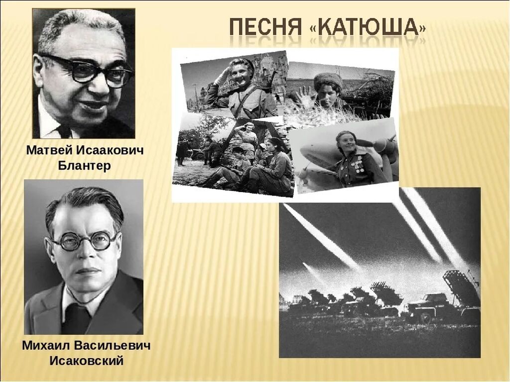 А начиналось всё с нескольких строк стихов, написанных Михаилом Исаковским, автором популярных в то время песен: «И кто его знает», «Прощание», «Зелеными просторами» и других. Поэт сочинил первые две строфы, а потом работа застопорилась…Михаил Васильевич, по его собственному признанию, не знал, что дальше делать с «Катюшей» до тех пор, пока судьба не свела его с композитором Матвеем Блантером.