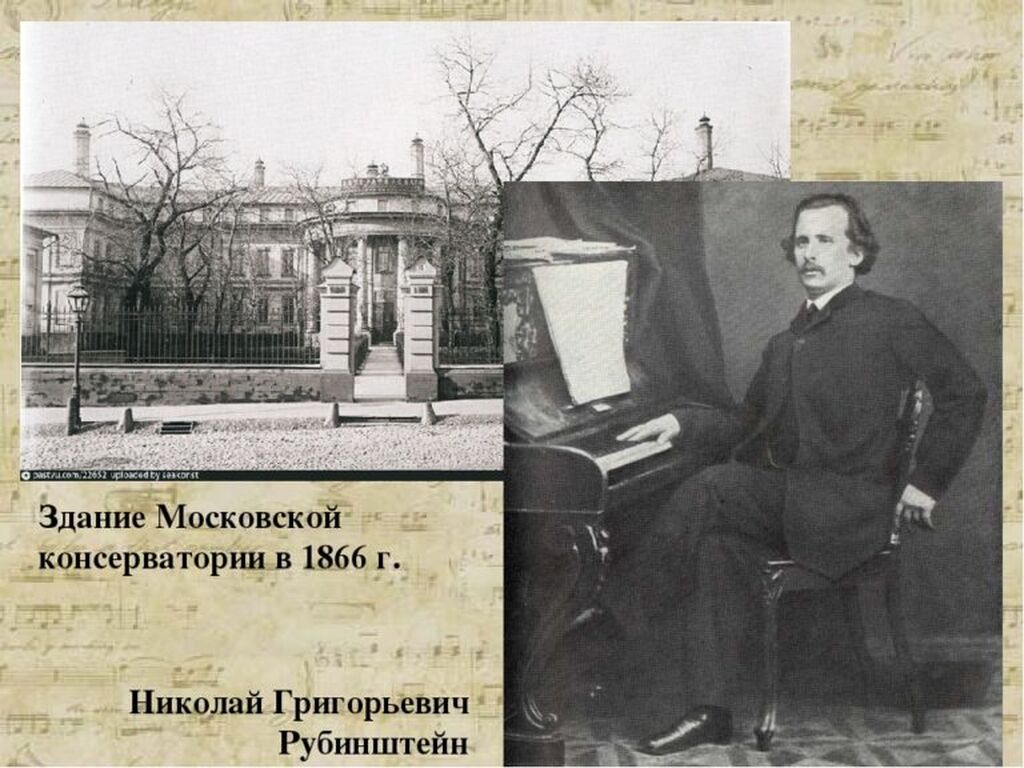 В 1860 году Н. Рубинштейн назначен руководителем московского отделения Русского Музыкального Общества, а в 1866 году занял пост директора Московской консерватории. Прекрасные способности управленца и организатора помогли Рубинштейну превратить консерваторию в центр музыкального образования и науки. Благодаря работе Николая Григорьевича, Московская консерватория получила право преподавать по собственным учебным программам, в ней была открыта единственная в России кафедра истории древне-русского церковного пения, а в преподавательский состав консерватории вошли лучшие композиторы и музыканты того периода.