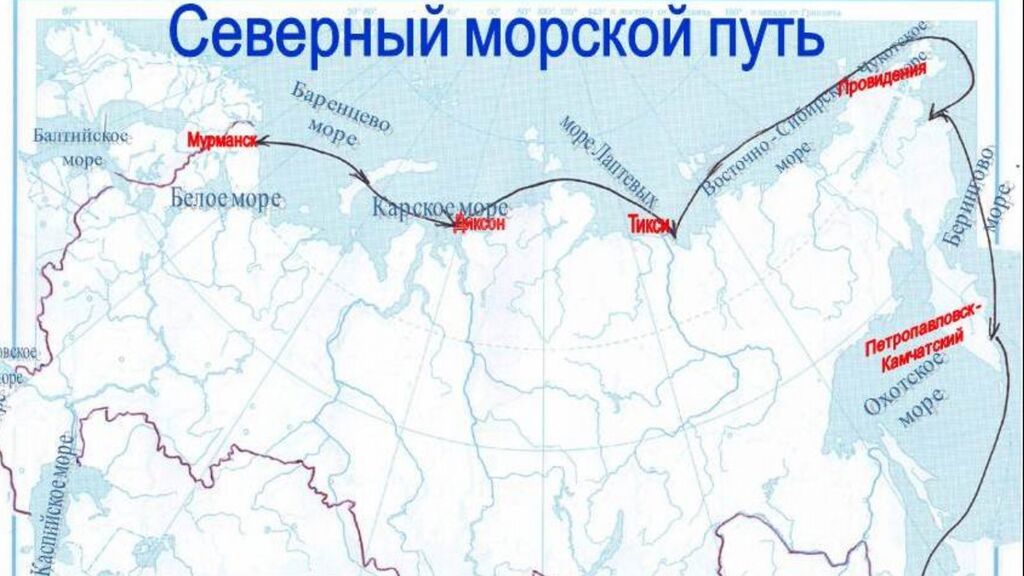 Длина Северного морского пути – 5600 км, он проходит вдоль северных и восточных берегов России через шесть морей: Баренцево, Карское, Лаптевых, Восточно-Сибирское, Чукотское и Берингово.