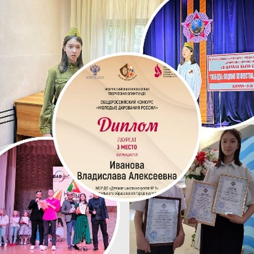 - участие Ивановой Владиславы – учащейся театрального отделения в Общероссийском конкурсе «Молодые дарования России» - всероссийской юношеской творческой олимпиады, где она была отмечена Дипломом Лауреата 3 степени;