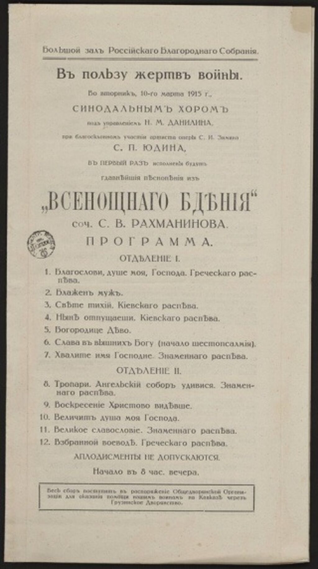 «Всенощное бдение» было задумано не для церковной службы, а для концертного исполнения. Тем не менее, Рахманинов настоял на премьере в Синодальном училище, поручив ее лучшему профессиональному церковному хору того времени – Синодальному хору (хору Успенского собора Московского Кремля) под управлением Николая Данилина.